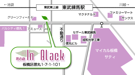 | 花の店 in Black 板橋区徳丸1−7−1 TEL 03−5399−3102 FAX 03−6231−0030 E-MAIL inblack@87ib.com |